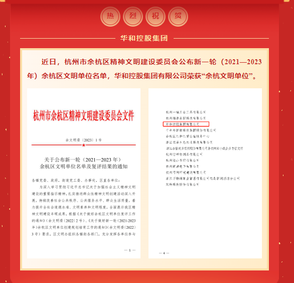 近日,杭州市余杭區精神文明建設委員會公布新一輪(2021—2023年)余杭區文明單位名單,華和控股集團有限公司榮獲“余杭文明單位”。